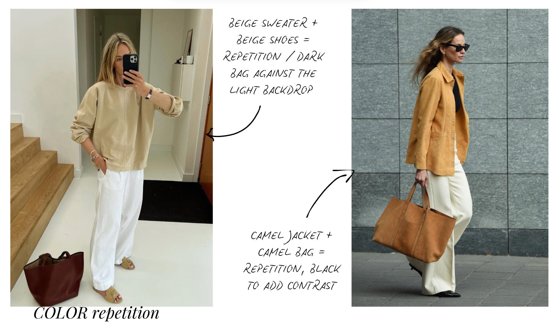Repeating elements is something I also do (color and materials).